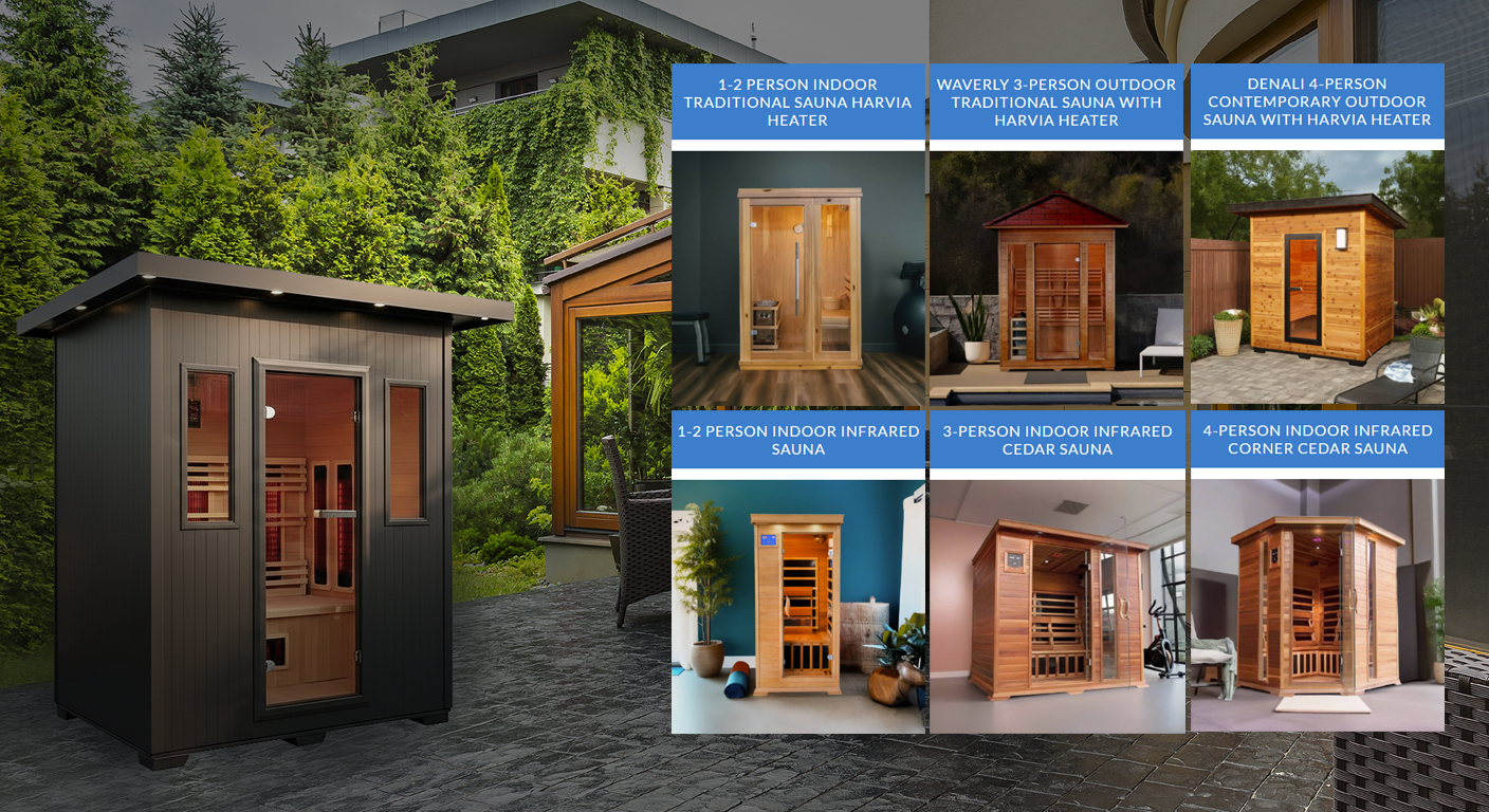 SunRay Saunas offers a full range of traditional and infrared home saunas in both indoor and outdoor configurations, with models sized for 1 to 4 people.